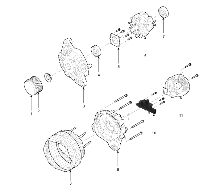 7. Rear bearing 8. Stator 9. Rear housing 10. Regulator 11. Rear cover |