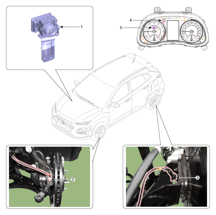 | 1. ABS control module (HECU) 2. Front wheel speed sensor 3. Rear wheel speed sensor |