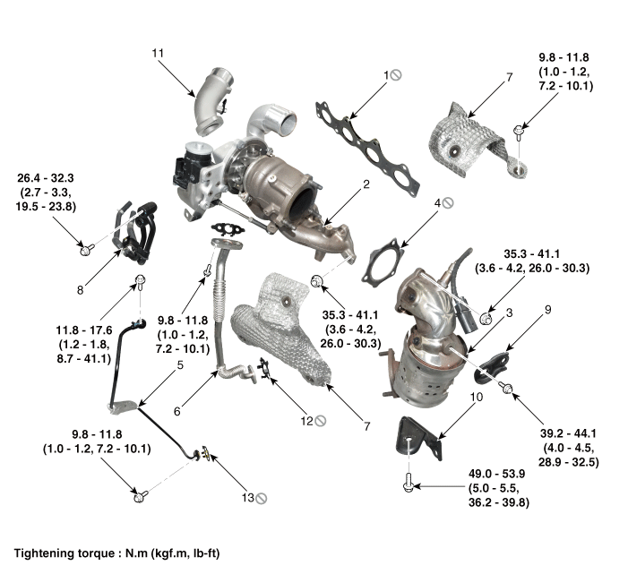 hose assembly 9. Warm-up catalytic converter stay A 10. Warm-up catalytic converter stay B 11. Intake pipe 12. Oil drain pipe gasket 13. Oil feed pipe gasket |