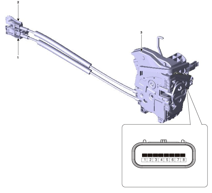 | 1. Door inside handle cable 2. Door lock/unlock knob cable |